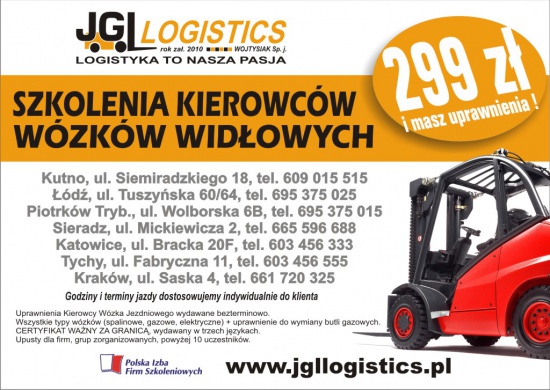 JGL Logistics Szkolenia kierowców wózków widłowych Kutno, ul. Siemiradzkiego 18 (POD WIADUKTEM) tel. 609 015 515